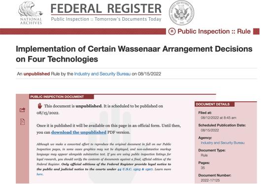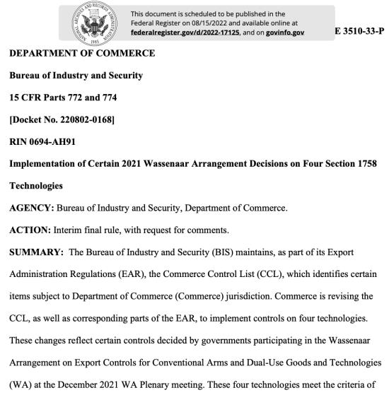 芯东西8月13日消息,,,美国商务部工业和安全局(BIS)周五在联邦公报上发布一项临时最终规定,,,,对4项“新兴和基础技术”实施最新