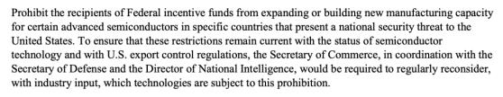 美国商务部副部长Alan Estevez说:“允许在芯片和涡轮发动机等技术能够更快、、更有效、、、更长久和在更恶劣条件下运行的技术进步,,,可能会在商业和军事方面改变游戏规则。。”此时正值美国竭力解决本土芯片安全隐患,,,并在打压中国大陆集成电路产业方面动作频频。。。本周,,,美国总统拜登签署《美国芯片与科学法案》,,至此该法案正式生效,,将拨款527亿美元推动本土芯片制造和研究,,,旨在使芯片制造大规模回流美国,,,,增强其本土芯片供应链弹性。。。而527亿美元的投资只是杯水车薪,,,据美国半导体行业协会(SIA)估算,,美国重构芯片供应链至少需4500亿美元,,美国芯片法案的实际执行成效如何仍有待观察。。。。该法案虽宣称提升美科技和芯片业竞争力,,但包含了一些限制中美正常科技合作的条款,,,,包括禁止获得联邦激励资金的企业在对美国构成国家安全威胁的国家大幅增产先进制程芯片,,,,期限为10年,,,违反者或被要求全额退还补贴资金。。